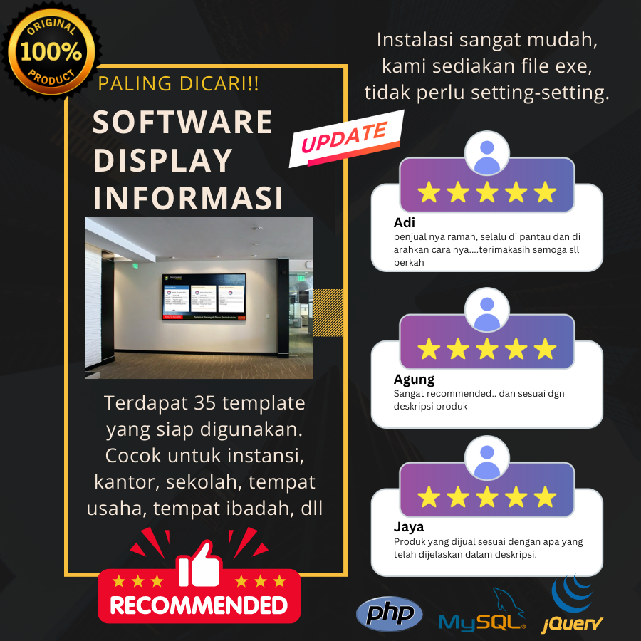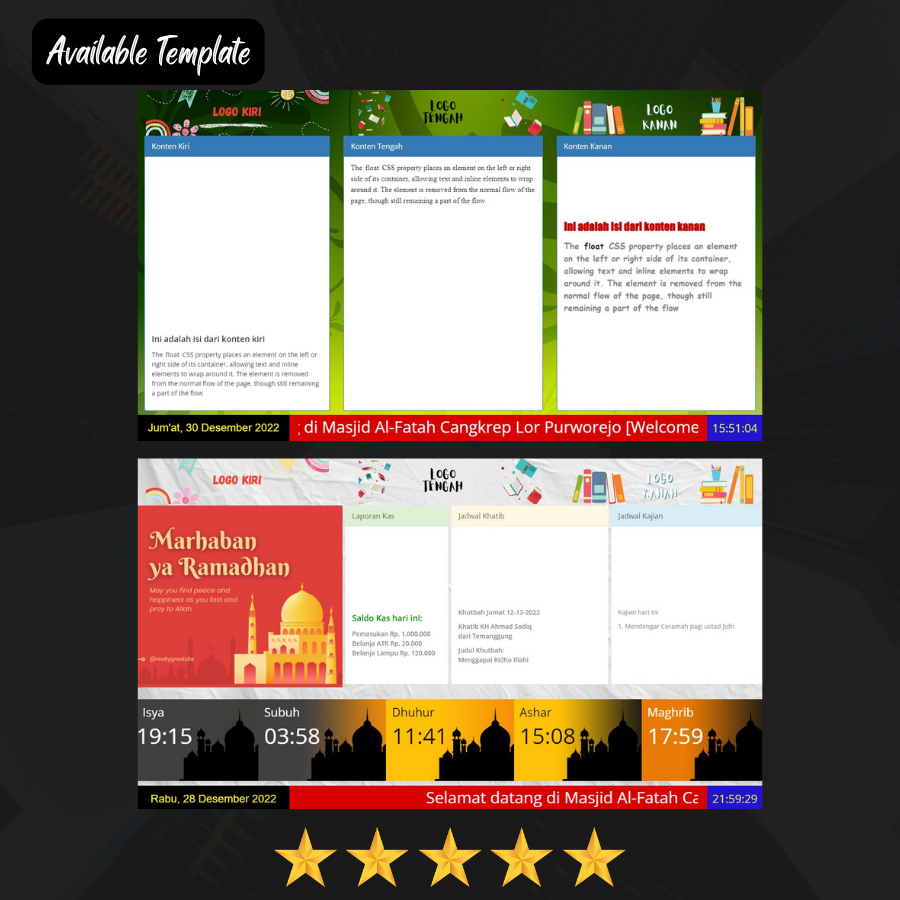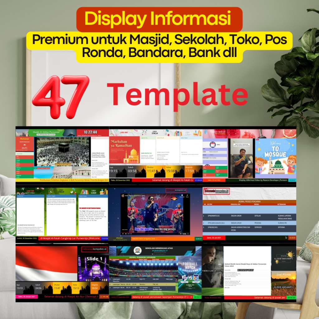 Display Informasi 47 Template Premium untuk Masjid, Sekolah, Toko, Pos Ronda, Bandara, Bank dllSoftware display informasi cocok untuk kantor/instansi/perusahaan/masjid/sekolah